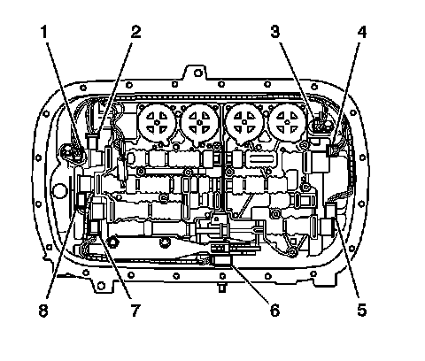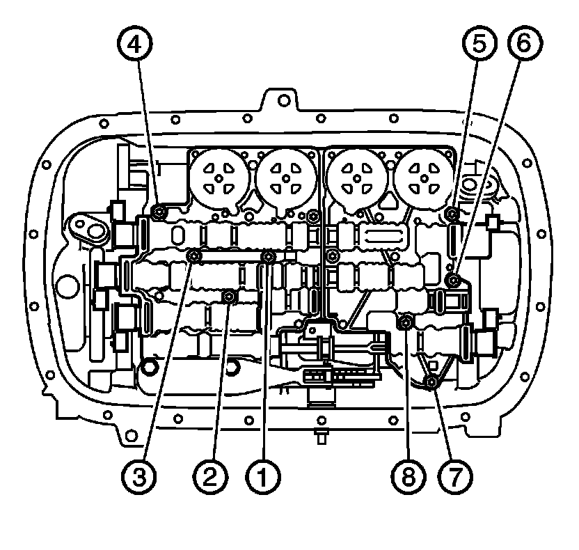 6. Install the control valve body accumulator assembly to the transmission case bolts (1-3) and hand tighten.