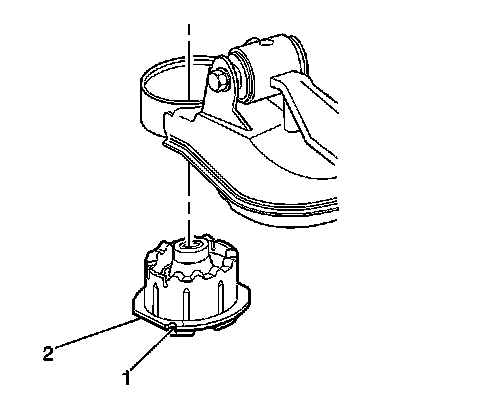 1. Tap the mount into the support assembly ensuring the flat is outboard (2) and the notch (1) is rearward upon the installation.