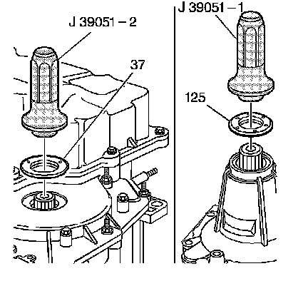 2. Using the J 39051-1 and the J 39051-2, install the new axle seals (37, 125). Use the output shaft (57) to pilot the seals and the tool into the case. Ensure that the snap rings are installed on the output shaft.
