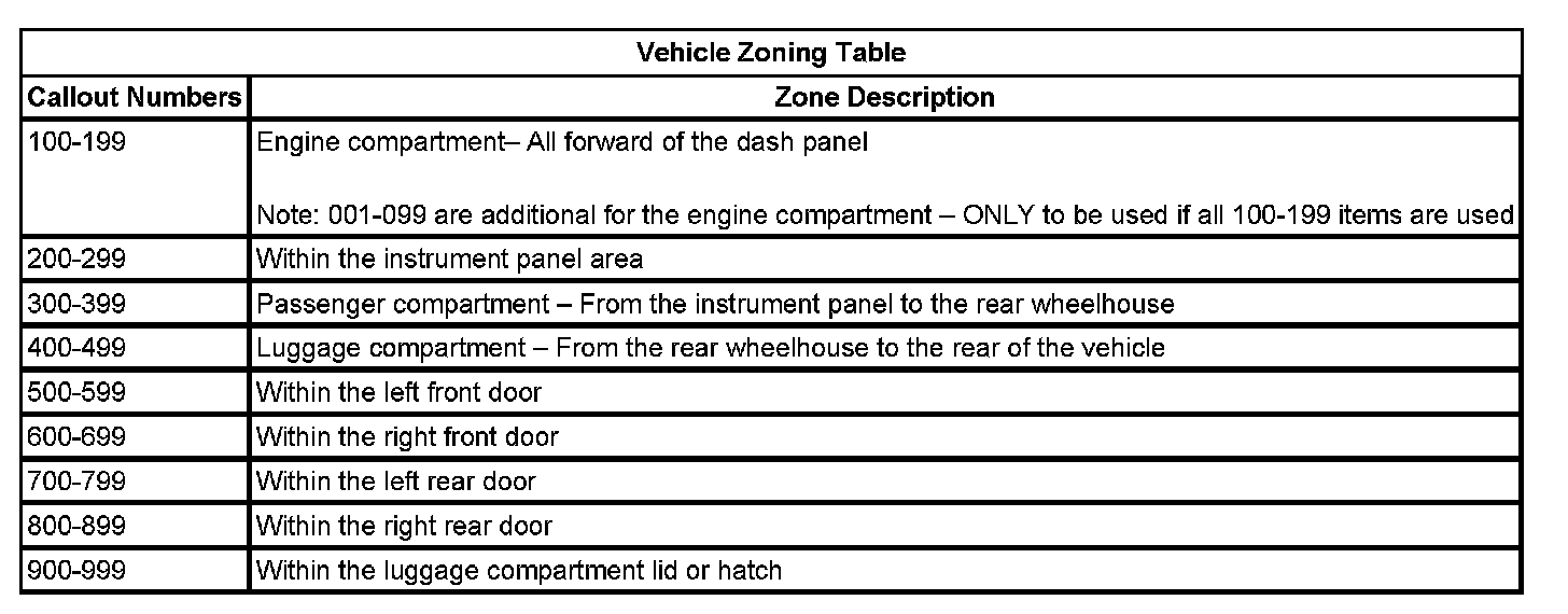 All grounds, in-line connectors, pass-through grommets, and splices have identifying numbers that correspond to where they are located in the vehicle. The following table explains the numbering system.