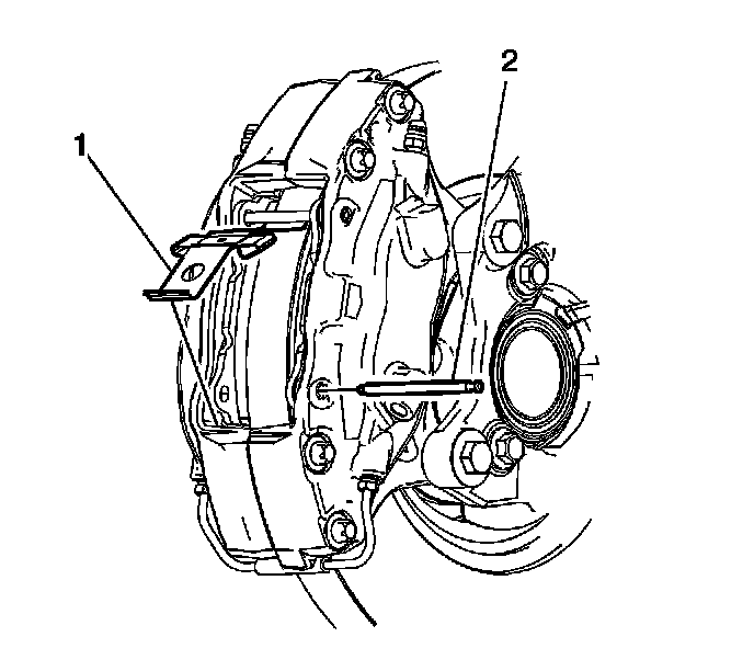 3. Install the upper caliper guide pin (2) through the caliper, inner and outer brake pads.