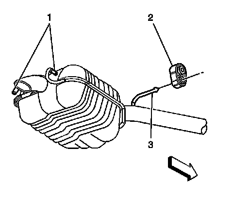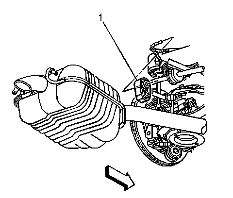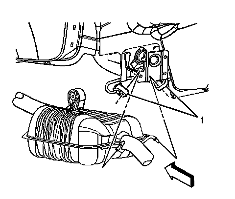 7. Pry the front exhaust hangers (1) free from the rear suspension hanger rods.