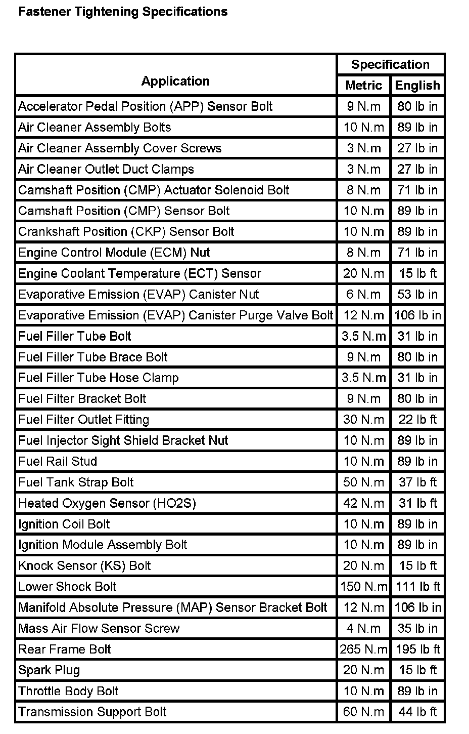 Fastener Tightening Specifications: