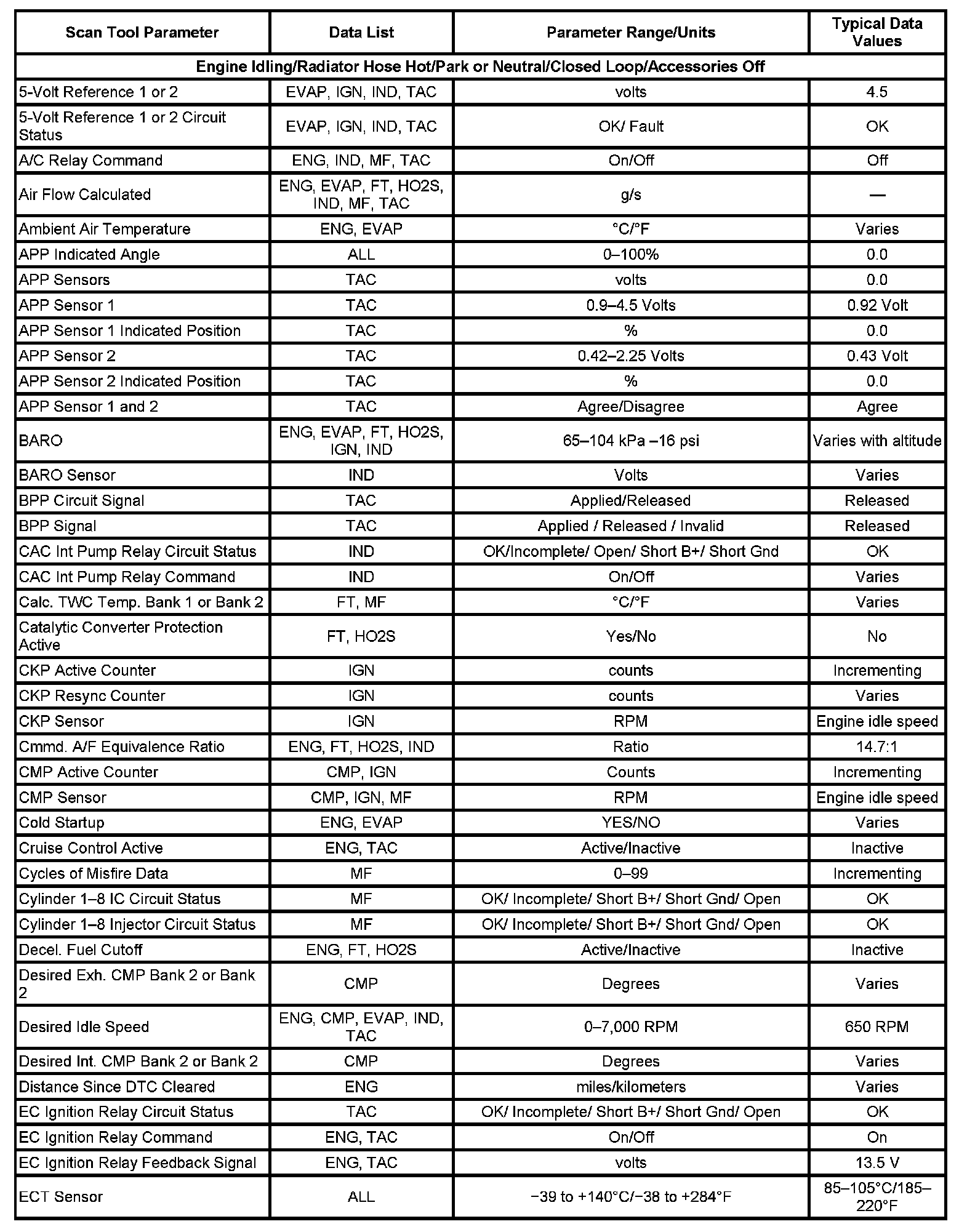 Scan tool values from a properly running engine may be used for comparison with the engine you are diagnosing. The Engine Scan Tool Data List represents the values that would be seen on a normal running engine.