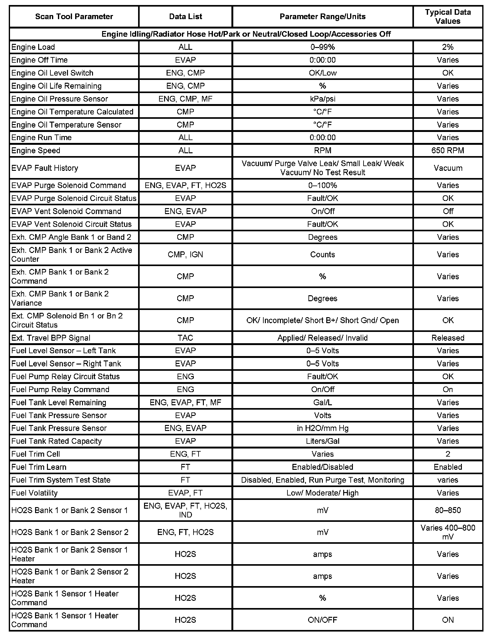 The Engine Scan Tool Data List contains all engine related parameters that are available on the scan tool. The list is arranged in alphabetical order. A parameter may appear in any one of the data lists, and in some cases may appear more than once, or in more than one data list in order to group certain related parameters together.