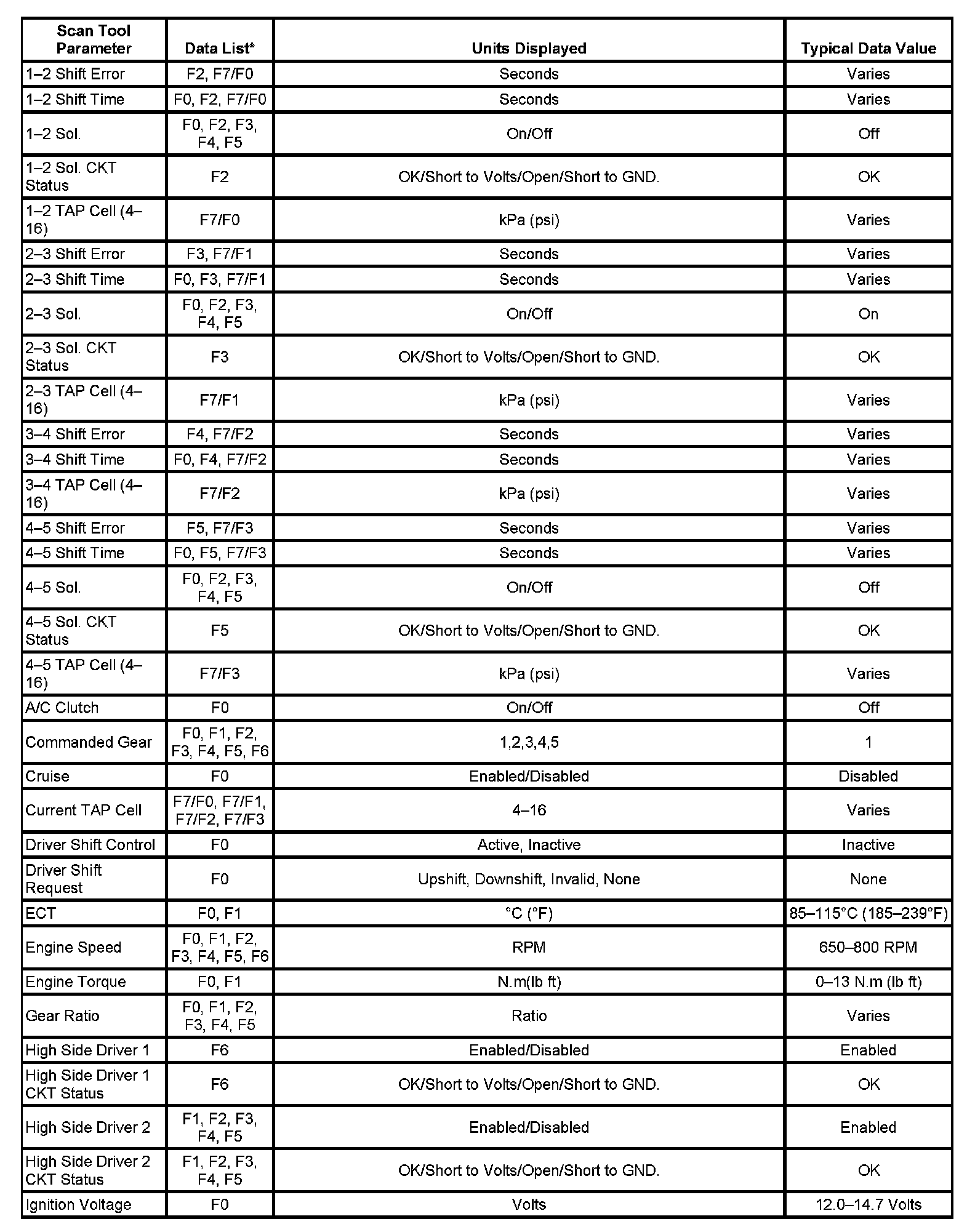 Only the parameters listed below are used in this service manual for diagnosing. If a scan tool displays other parameters, the values are not recommended by General Motors for use in diagnosis.