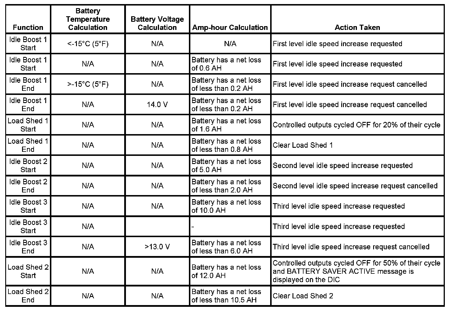 The PMM will either request an increase in the engine idle speed to the ECM or the PMM will cycle or turn OFF loads, called the load-shed function, in order to preserve the vehicle electrical system operation. The criteria used by the PMM to regulate this electrical load management are outlined below: