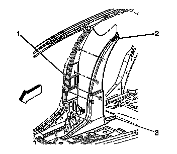 44. Install the center pillar garnish moldings (3). Refer to Center Pillar Garnish Molding Replacement .