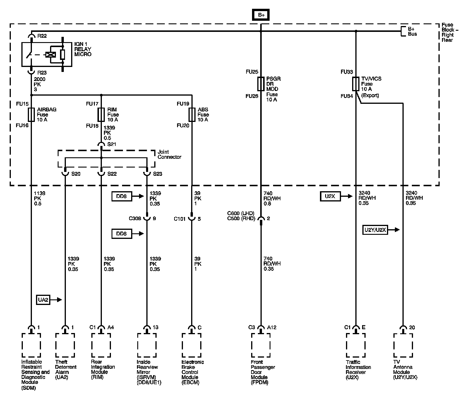 Right Rear Fuse Block - IGN 1 Relay, AIR BAG, RIM, ABS, PSGR DR MOD, and TV/VICS Fuses