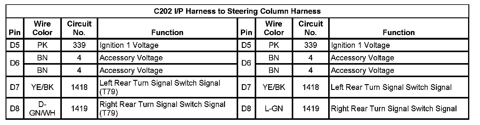 C202 I/P Harness To Steering Column Harness (Pin D5 To D8):