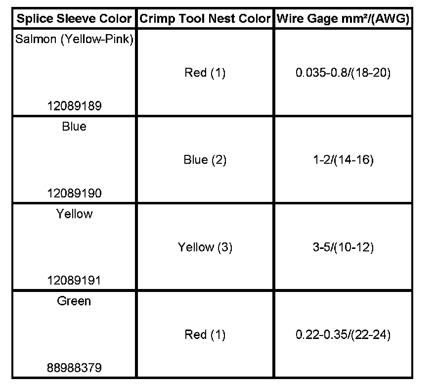 6. Select the proper DuraSeal splice sleeve according to the wire size. Refer to the above table at the beginning of the repair procedure for the color coding of the DuraSeal splice sleeves and the crimp tool nests.