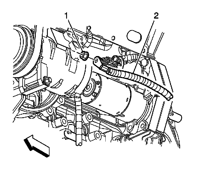 5. Remove the starter terminal nut (1) and the battery positive cable (2) from the starter.