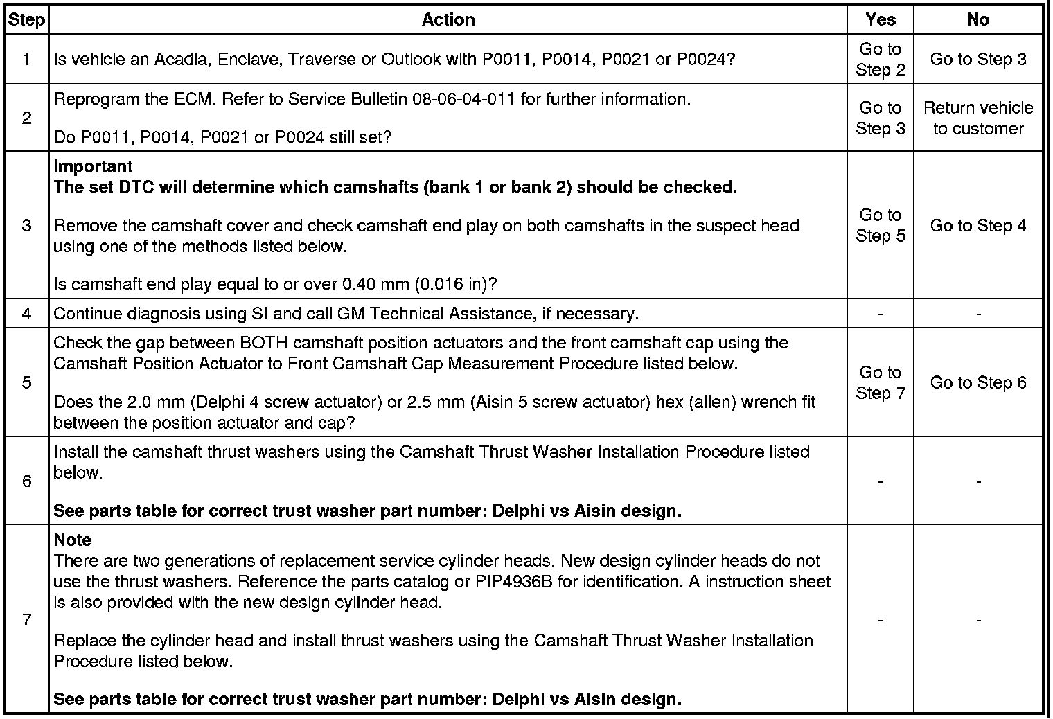 4. If the wrench fits between the camshaft position actuator and the front camshaft cap, it will be necessary to replace the cylinder head assembly. WHEN REPLACING THE CYLINDER HEAD, ALSO INSTALL A THRUST WASHER BETWEEN EACH CAMSHAFT POSITION ACTUATOR AND THE FRONT CAMSHAFT CAP. See parts table for correct trust washer part number: Delphi vs Aisin design.