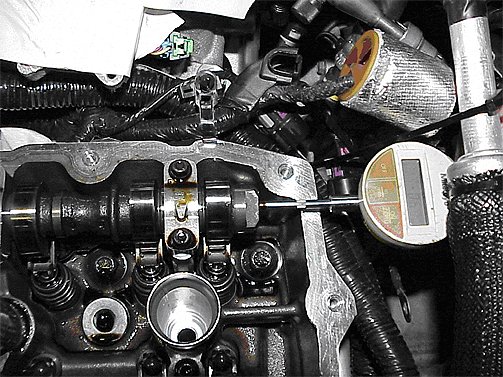 - Set-up a dial indicator on the camshaft to be measured. Set the dial indicator to measure the axial movement of the camshaft. To minimize measurement error, the dial indicator needs to be on the same axis as the camshaft. A magnetic mount can be placed on the frame rail or a piece of steel plate can be bolted to the top of the head as a reference surface for the dial indicator. The dial indicator should have 0.1 mm (0.001 in) of resolution.