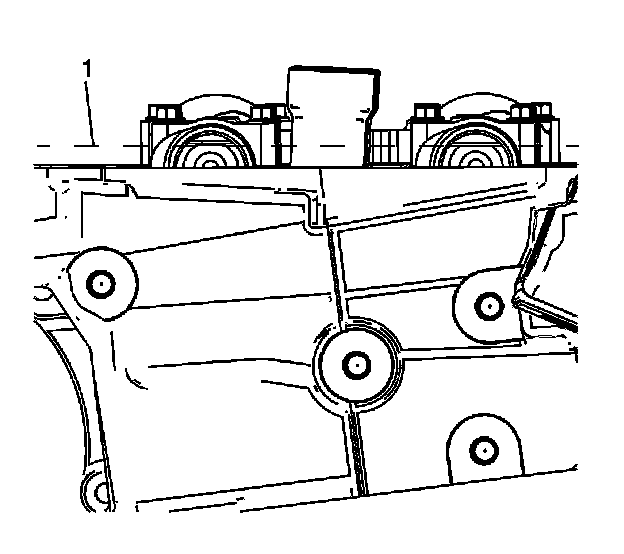 4. Rotate the crankshaft balancer using the balancer bolt until the camshafts are in a neutral (low tension) position. The flats on the rear of the camshafts will be parallel with the camshaft cover rail (1).