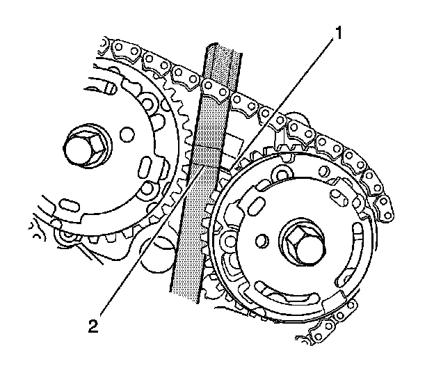 5. Use a paint stick to create an alignment mark on one of the timing chain links (2) and the adjacent tooth on the exhaust camshaft position actuator (1).