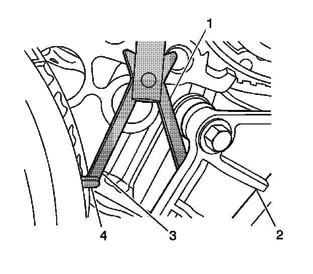 Ensure that the foot (1) of the Timing Chain Retention Tool is engaged into one of the link pockets to prevent tool slippage during tightening of the Timing Chain Retention Tool.