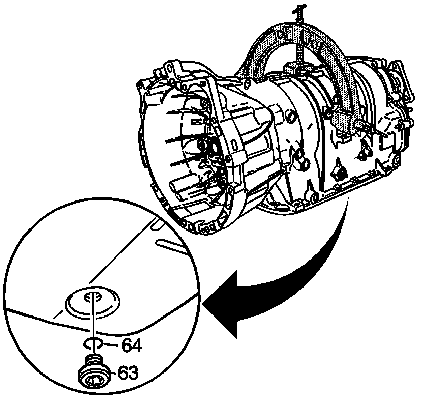 1. Remove the fluid pan drain plug (63) and seal (64), and allow the transmission fluid to drain.