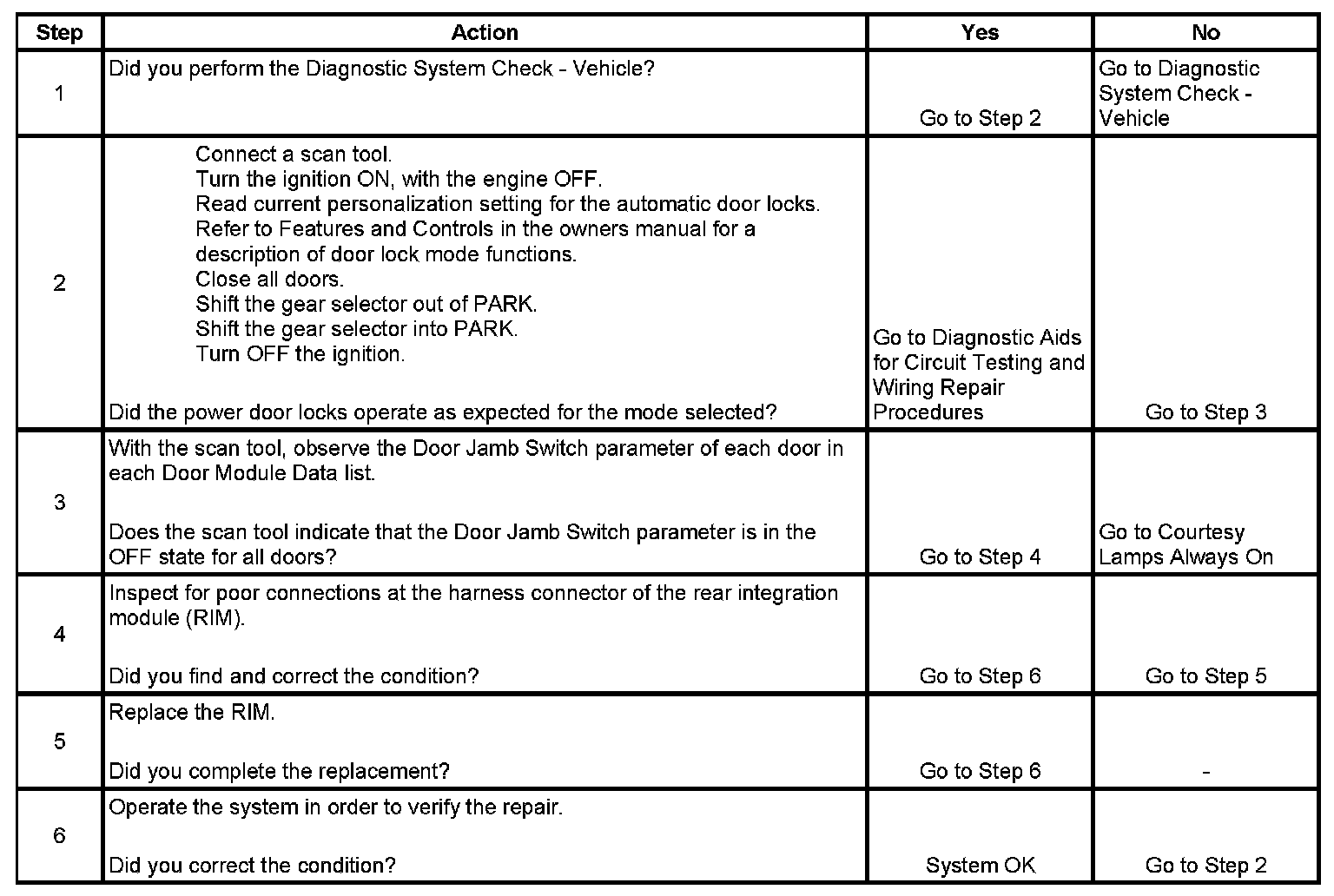 3.This step determines if the door jamb switch, also known as the door open switch, may be the cause of the malfunction. If the status of any door is interpreted as open, the rear integration module (RIM), which is the door lock master, will not permit the doors to automatically lock. If the scan tool display indicates that the door open/jamb switch is active when in fact the door is closed, it is likely that a failure has occurred to the door open/jamb switch or its circuits. Since the door open/jamb switch also controls courtesy lights, this failure is diagnosed in Lighting Systems.