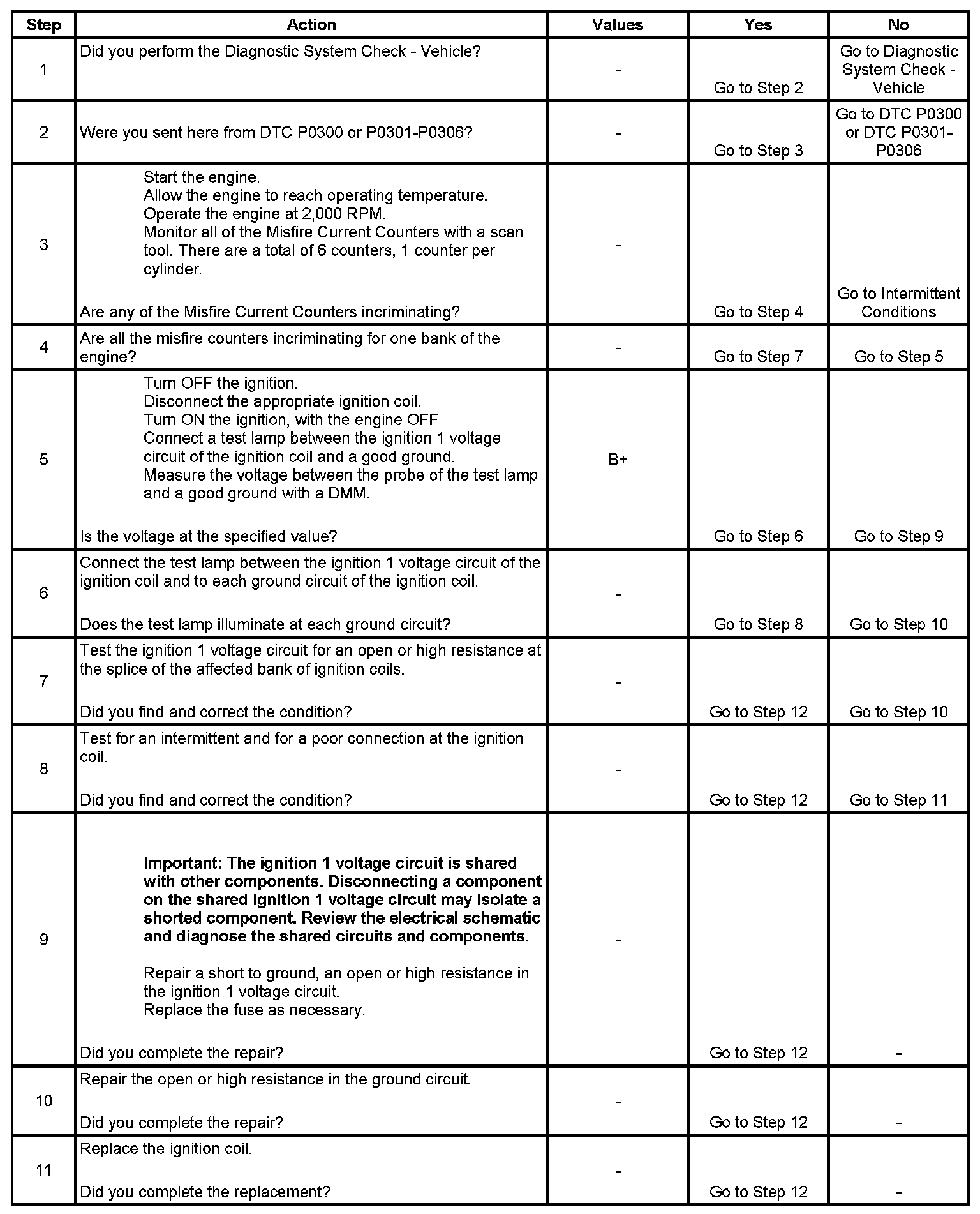 6. This step determines if the ground circuit is open. If the circuit is open, the ignition coils would be inoperative for one bank of the engine.