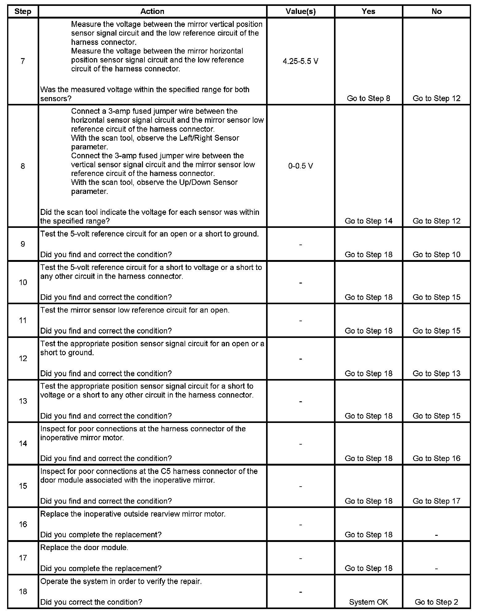 7. This step verifies that the voltage applied by the door module to the mirror position sensor circuits is within the appropriate range. When the mirror motor harness connector is disconnected the measured voltage for each sensor should be 4.25-5.5 volts.