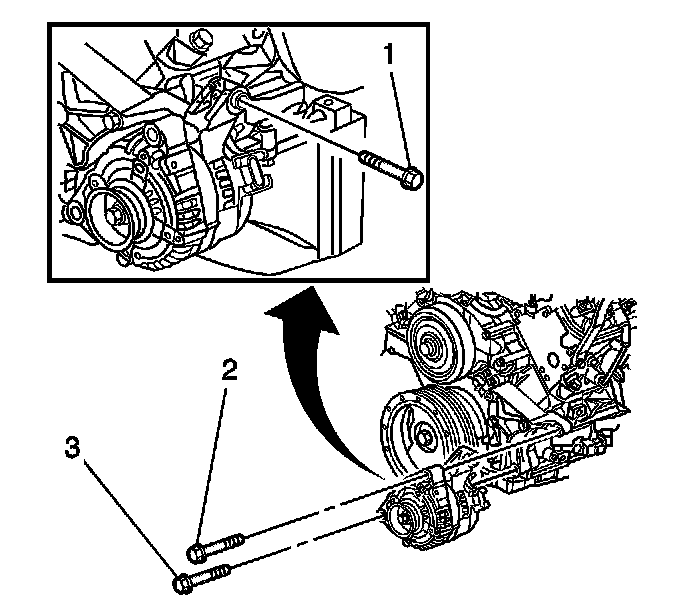 1. Tighten the front generator mounting bolt (3) to 50 N.m (37 lb ft).
