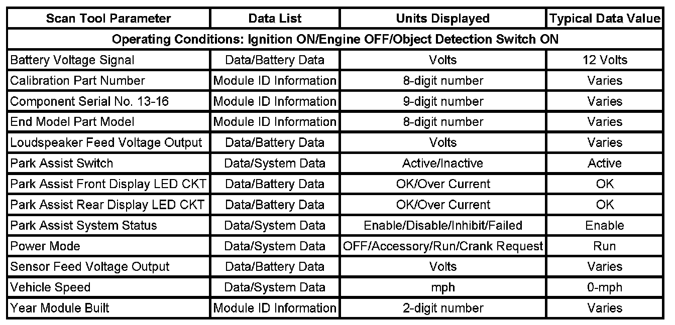 The scan tool data list contains all the object detection system related parameters that are available on the scan tool. The parameters in the list are arranged in alphabetical order. The column, Data List, indicates the location of the parameter within the scan tool menu selections.