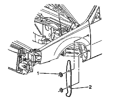 2. Remove the push on retainers (1) securing the front fender sound insulator (2) to the vehicle.