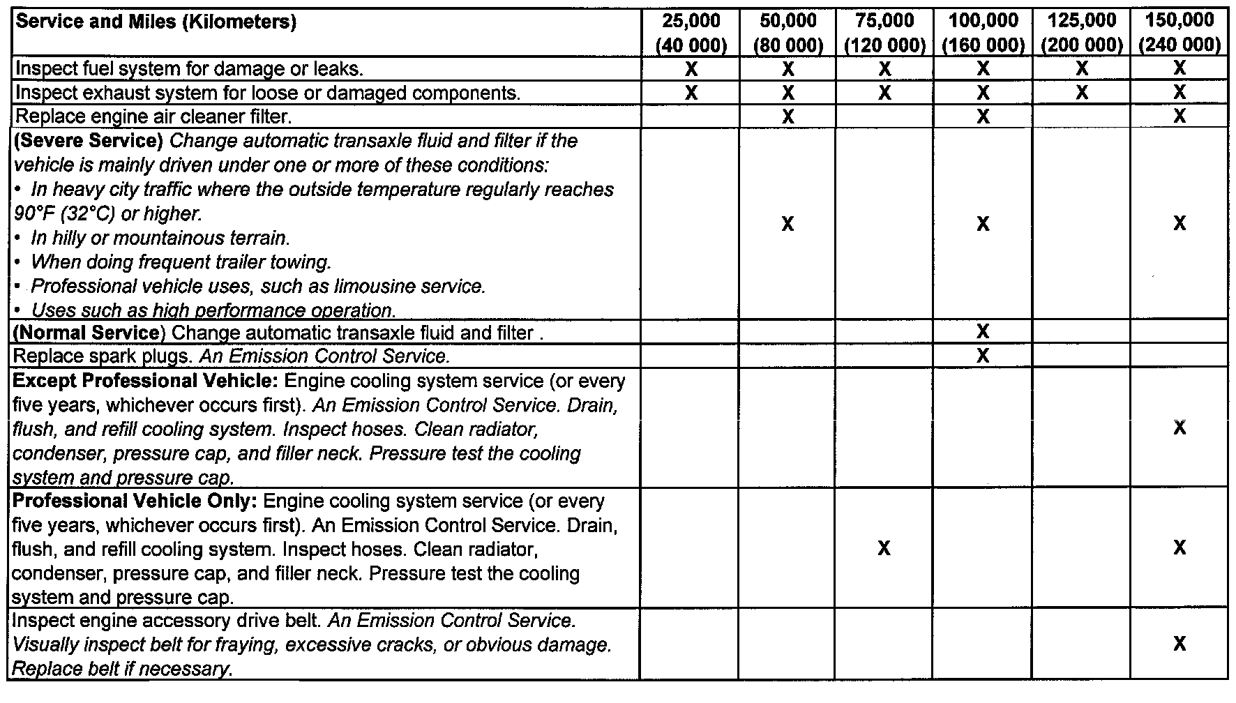 service (I or II) after the indicated miles (kilometers) shown for each item.