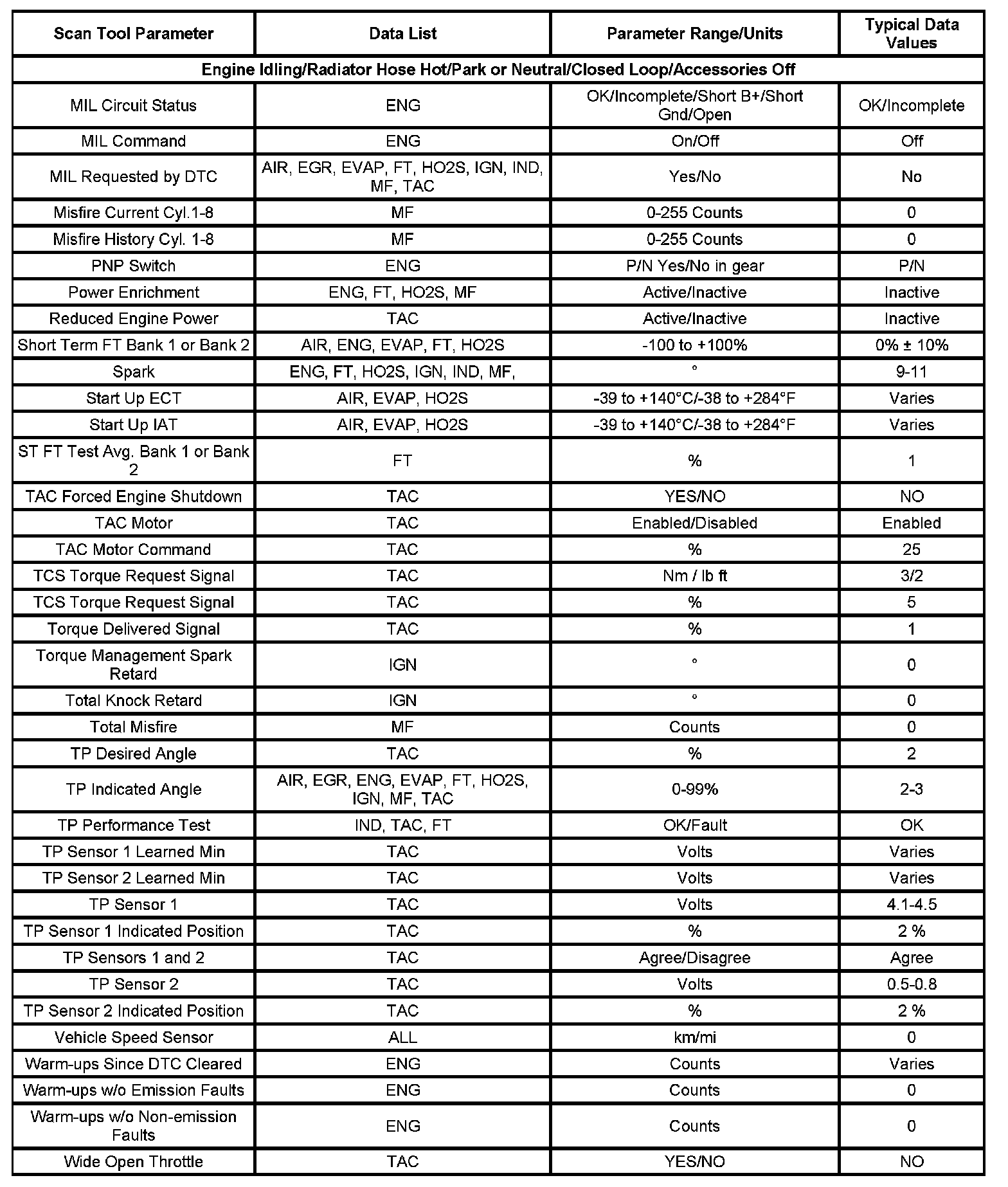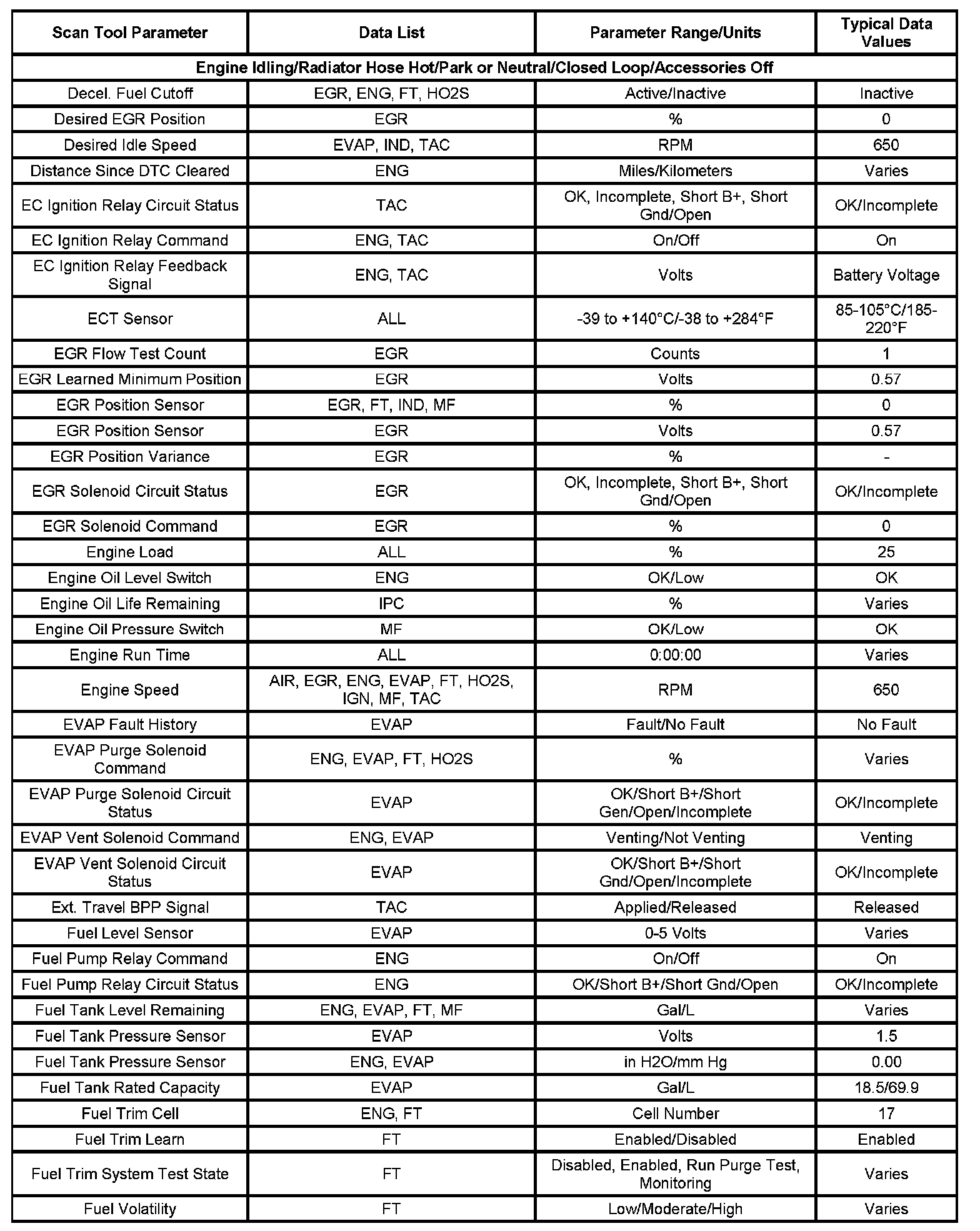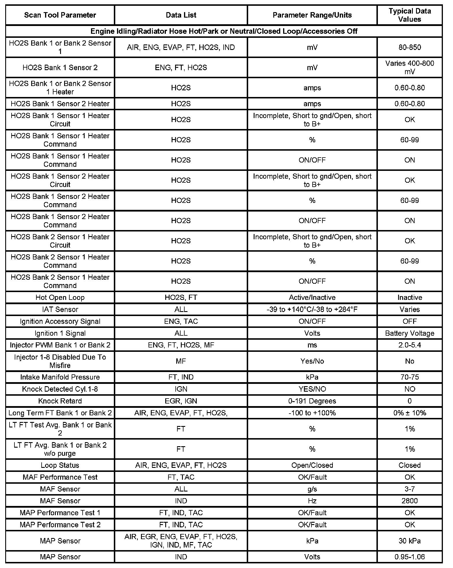 Scan tool values from a properly running engine may be used for comparison with the engine you are diagnosing. The Engine Scan Tool Data List represents the values that would be seen on a normal running engine.