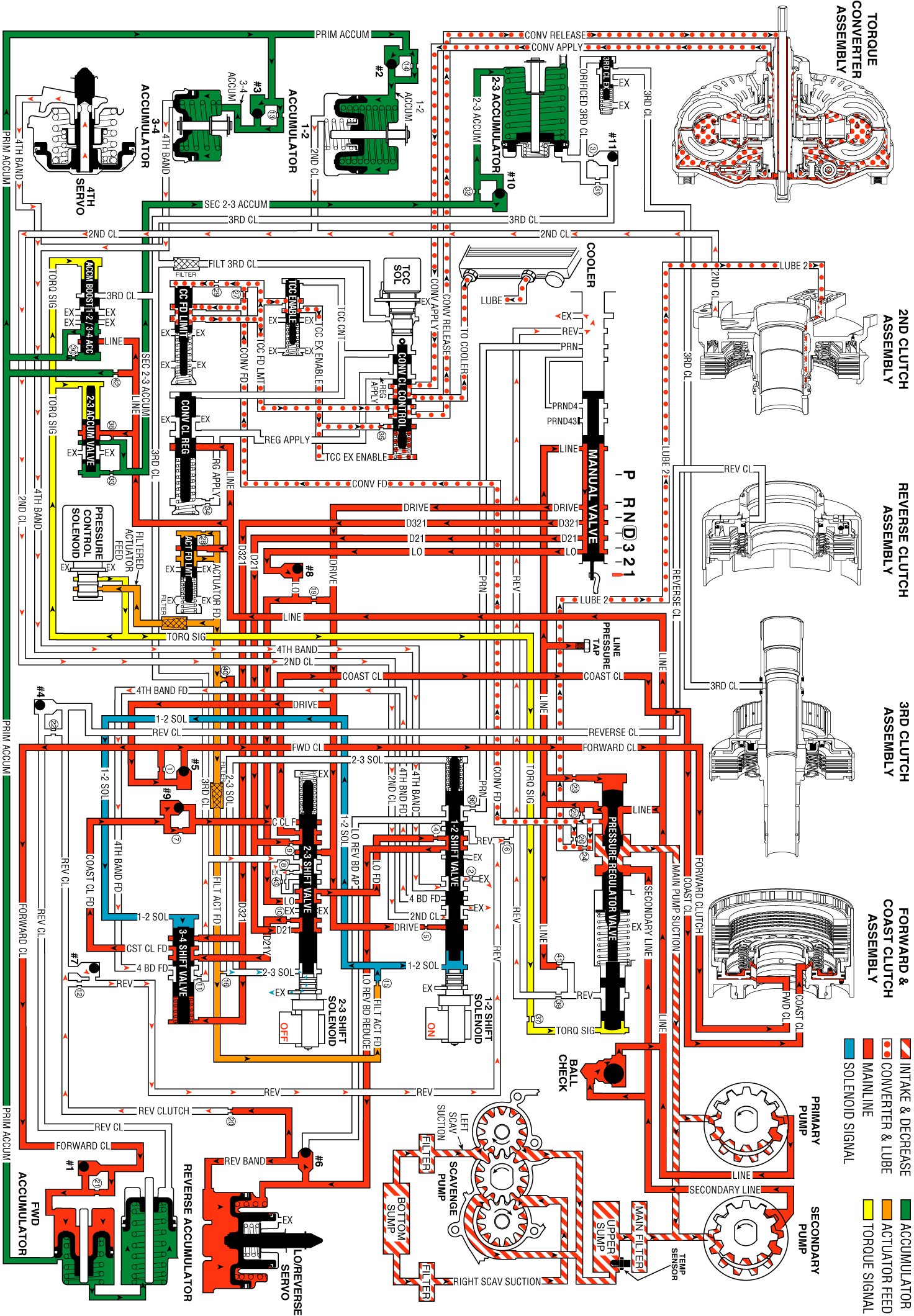 Low fluid pressure unseats the #8 checkball, which is located in the valve body. This pressure then routes Low fluid to the 2-3 shift valve.