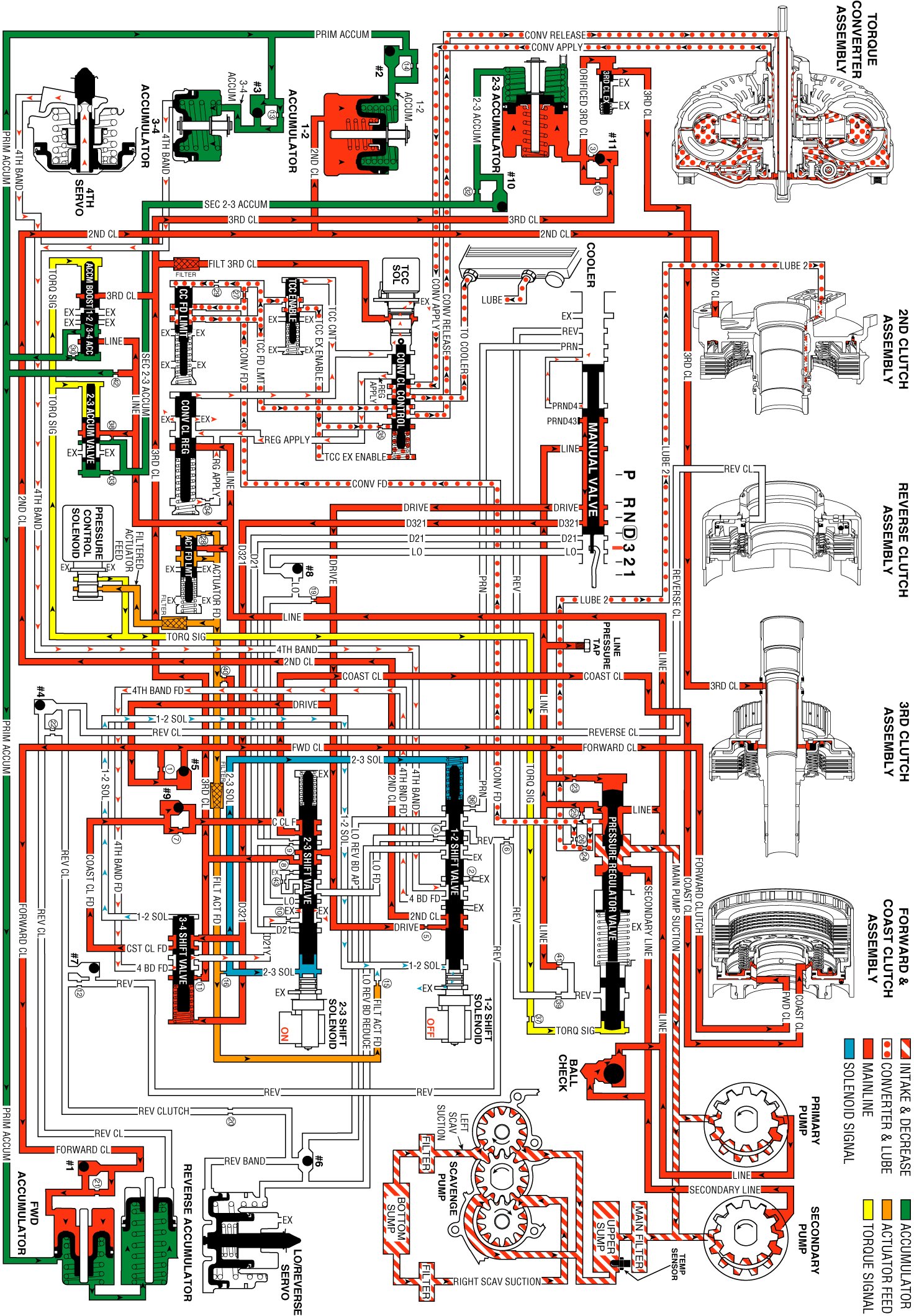 The #9 checkball is located in the valve body, and the checkball is unseated by coast clutch feed. The checkball routes fluid through orifice #7, where the fluid enters the coast clutch circuit. Coast clutch fluid is then routed to the 2-3 shift valve.
