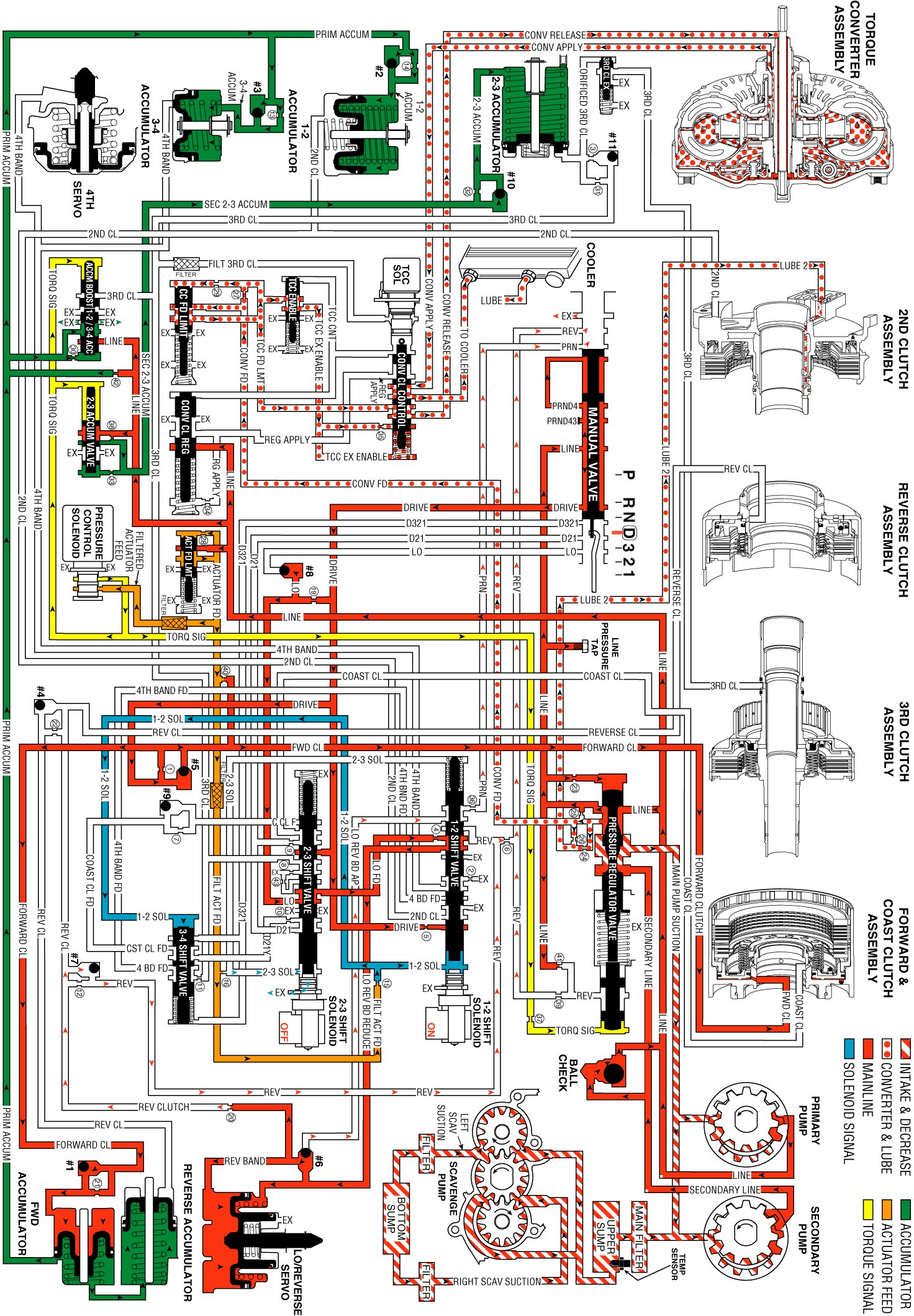 Forward clutch fluid actuates the forward accumulator piston during the apply of the forward clutch. Primary accumulator fluid on the spring side of the piston is forced back through its circuit to the 1-2 & 3-4 accumulator valve.