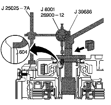 3. Locate the J tab of the J 39686 on the input shaft (604). The arrow on the J tab should have a 90 degree orientation.