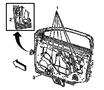 8. Disconnect the wiring harness rosebud retainers (1) from the inner front door panel.