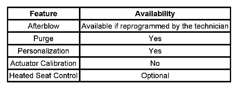 If the remote start personalization feature for climate control is selected through radio, the HVAC control module will receive information that defines the current driver of the vehicle from the Ezkey module through GMLAN communication. This information shall be stored inside the HVAC control module memory. When a different key fob is selected, the HVAC control module will recall the appropriate driver settings. The full auto mode and previous set temp will be commanded if inside air temperature is above 0°C. Defrost mode will be commanded when the inside air temperature is below 0°C. Upon a battery reset, the HVAC control module shall also set the driver ID to Driver#1. The HVAC system will memorize the following system configurations for up to 2 unique drivers: