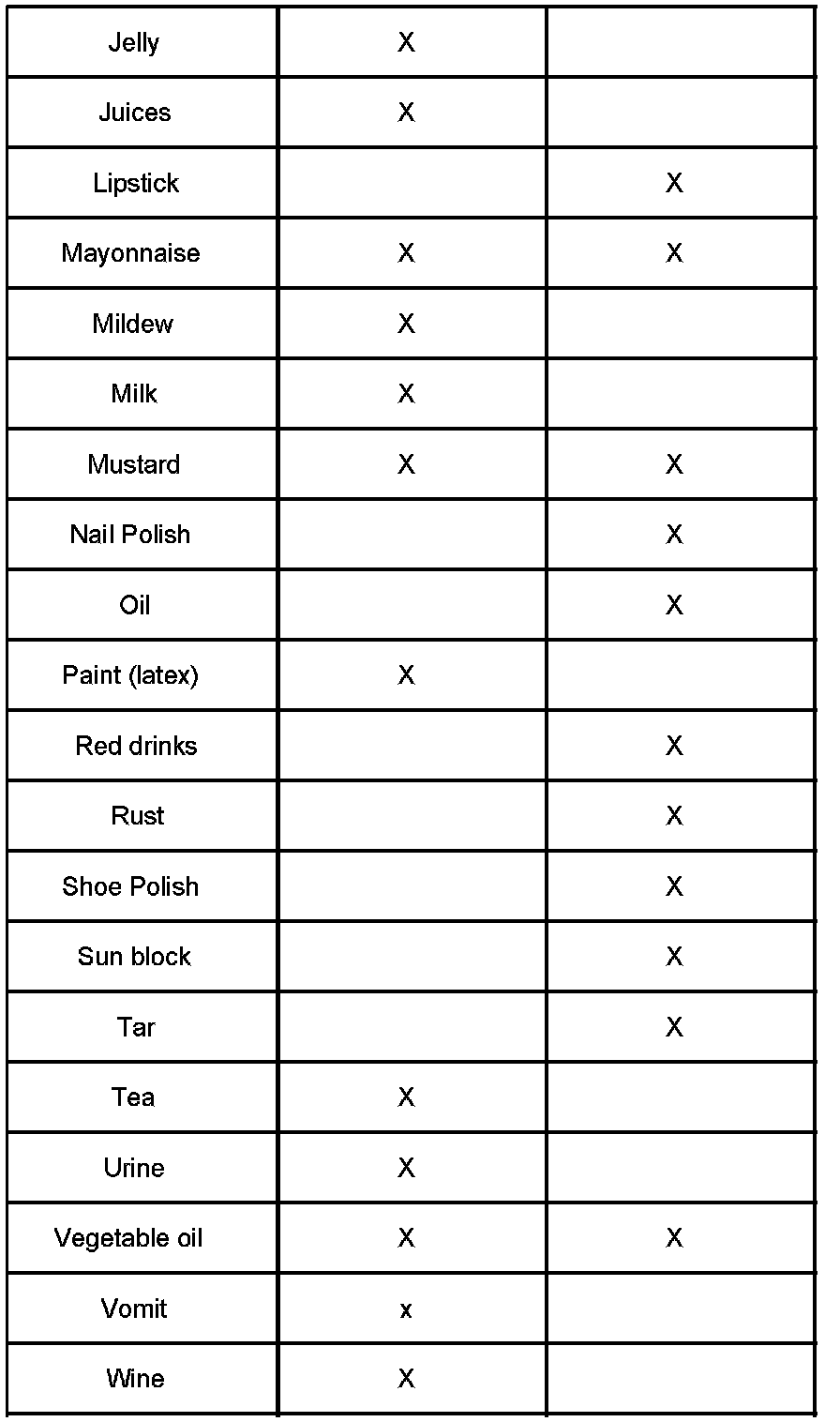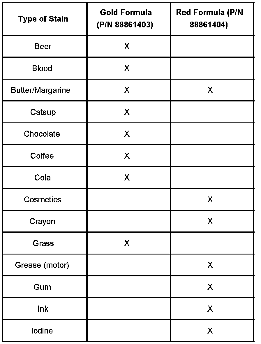 When cleaning upholstery and carpet stains ONLY, the cleaning chart shown will help you determine which cleaner/formula works best on a particular stain. The chart lists many of the common stains. Some complex stains may require the application of both stain removers, one after the other, to remove both food-based oils and synthetic oils.