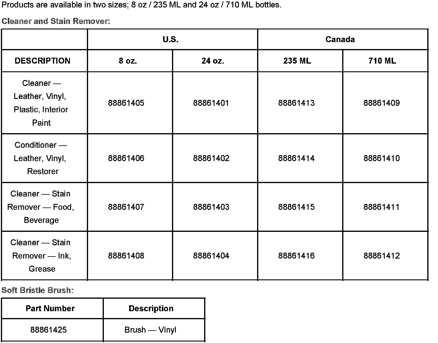 A soft bristle brush (P/N 88861425) should be used to safely work the cleaner into the leather grain or material. This enables the dirt/stain to be completely removed from the material.