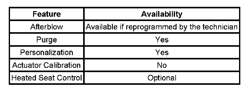 If the remote start personalization feature for climate control is selected through radio, the HVAC control module will receive information that defines the current driver of the vehicle from the Ezkey module through GMLAN communication. This information shall be stored inside the HVAC control module memory. When a different key fob is selected, the HVAC control module will recall the appropriate driver settings. The full auto mode and previous set temp will be commanded if ambient air temperature is above 0°C (32°F). Defrost mode will be commanded when the ambient air temperature is below 0°C (32°F). Upon a battery reset, the HVAC control module shall also set the driver ID to Driver#1. The HVAC system will memorize the following system configurations for up to 2 unique drivers: