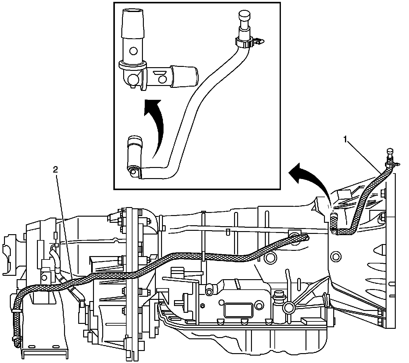 With the transmission still removed from the vehicle due to water intrusion repairs, remove the complete transmission vent hose (1) and (2) from the transmission and/or the vehicle.
