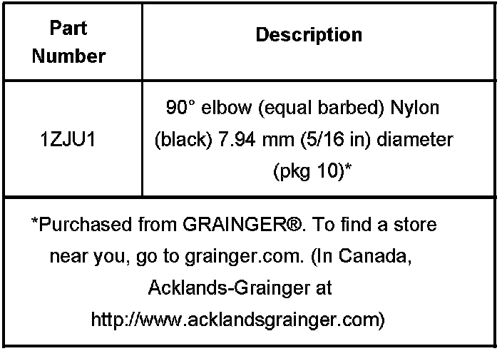 The 90° elbow used in this bulletin was purchased from GRAINGER(R). The part number is 1ZJU1 (pkg 10). To find a store near you, go to grainger.com. or purchase the equivalent at a local automotive supplier.