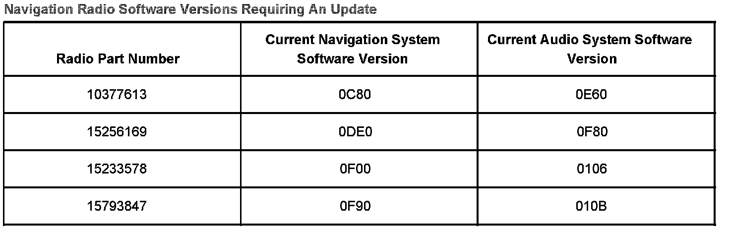 Obtain a software upgrade disc set by contacting the GM Navigation Disc Center at 1-877-628-3472 per Corporate Bulletin Number 06-08-44-012A (DVD Navigation Update Program, AVN Software Update Discs and Ordering Information). The center will require your BAC code, dealer code and shipping address. Advanced Vehicle Navigation (AVN) software discs are for the dealer to update the navigation radio software only. They DO NOT update or replace the navigation map disc that is supplied with the vehicle. Please order these parts only as needed. There is a limited supply of these discs available. Do not order these discs for stock. The AVN software update discs can be used to reprogram more than one vehicle. The first update disc for each part number is free. Subsequent copies of the same part number for the same dealer will cost $50.