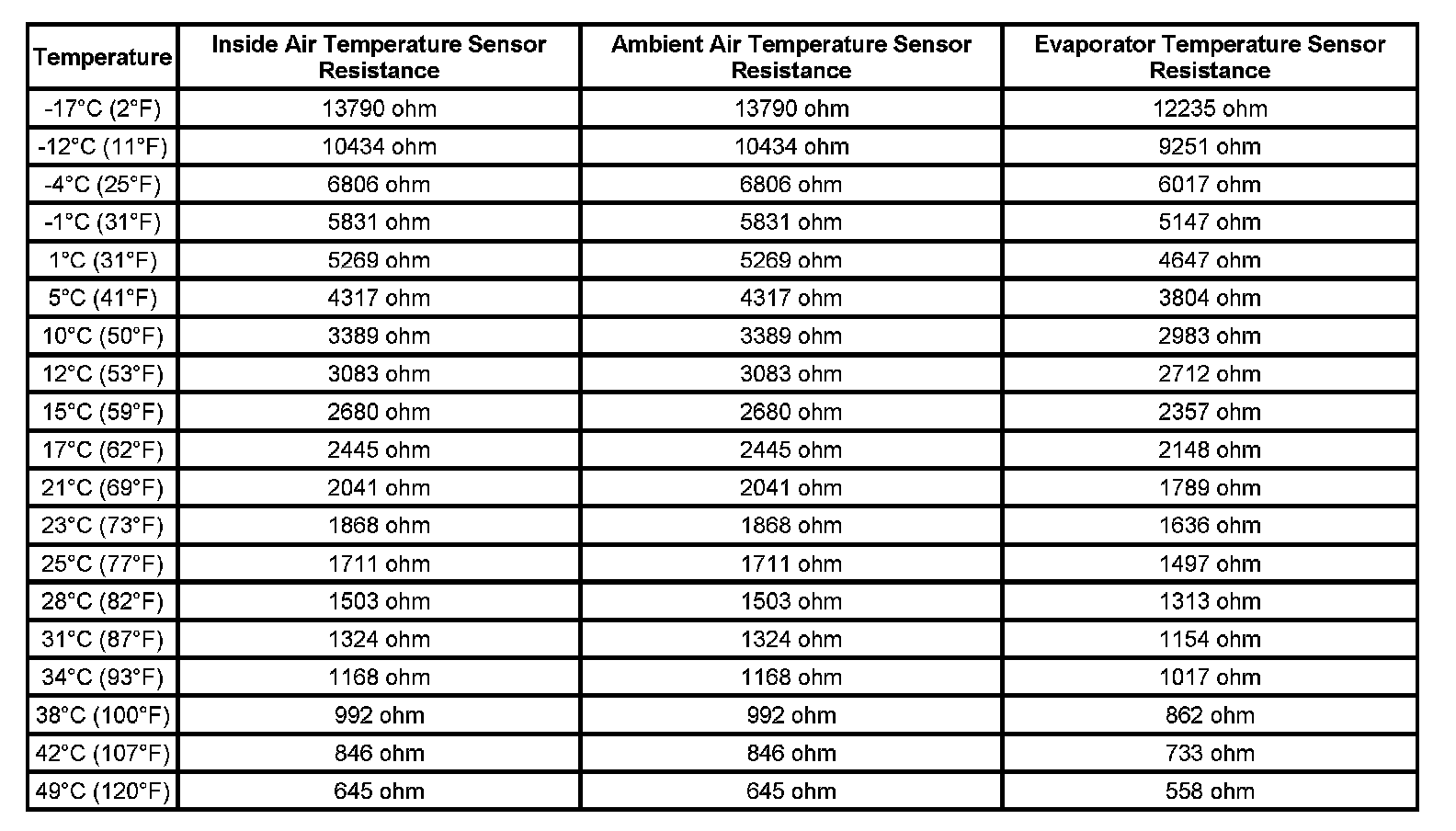 Sensor Resistance Table