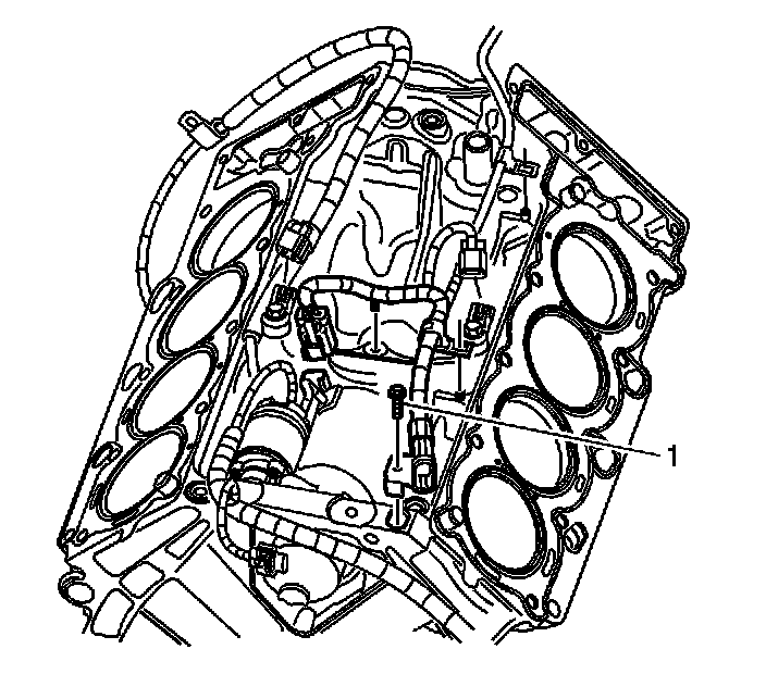 15. Install the knock and crankshaft position sensor wiring harness bolt (1).