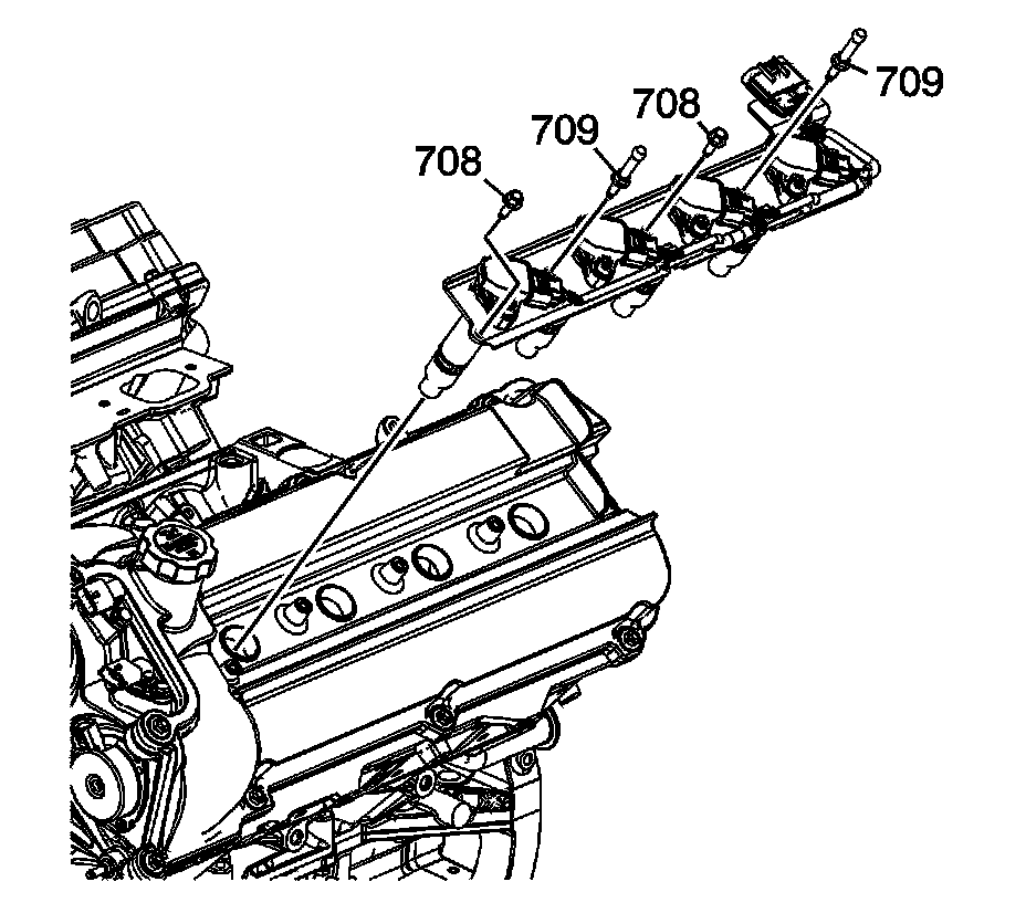 2. Remove the ignition coil assembly bolts (708) and ball studs (709).