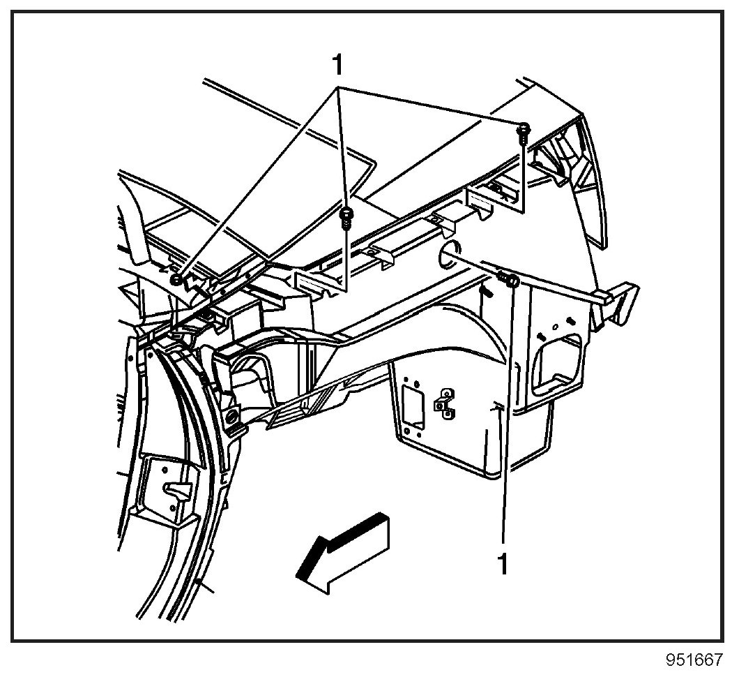 4. Remove the bolts (1) attaching the rear compartment frame to the rear compartment panel.