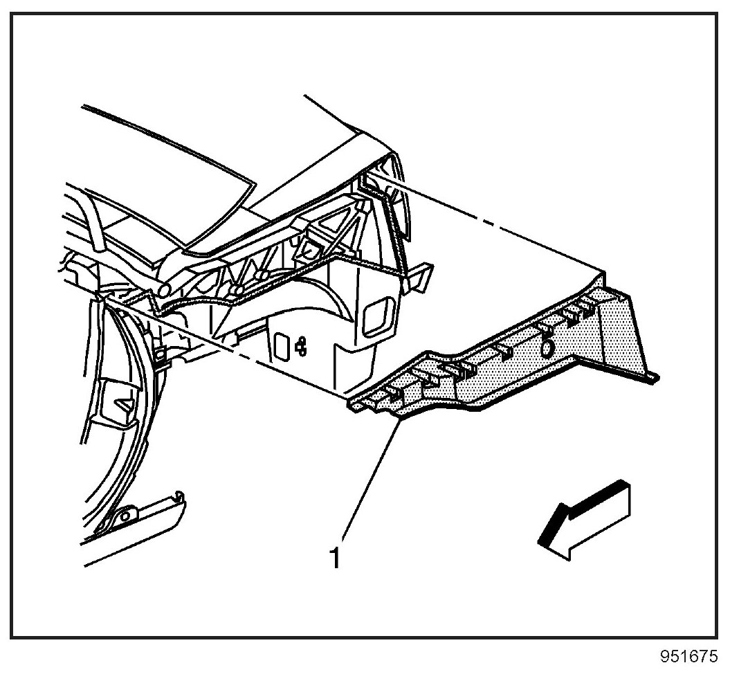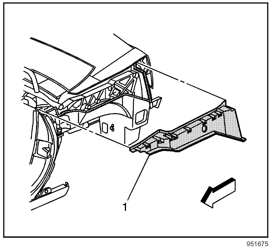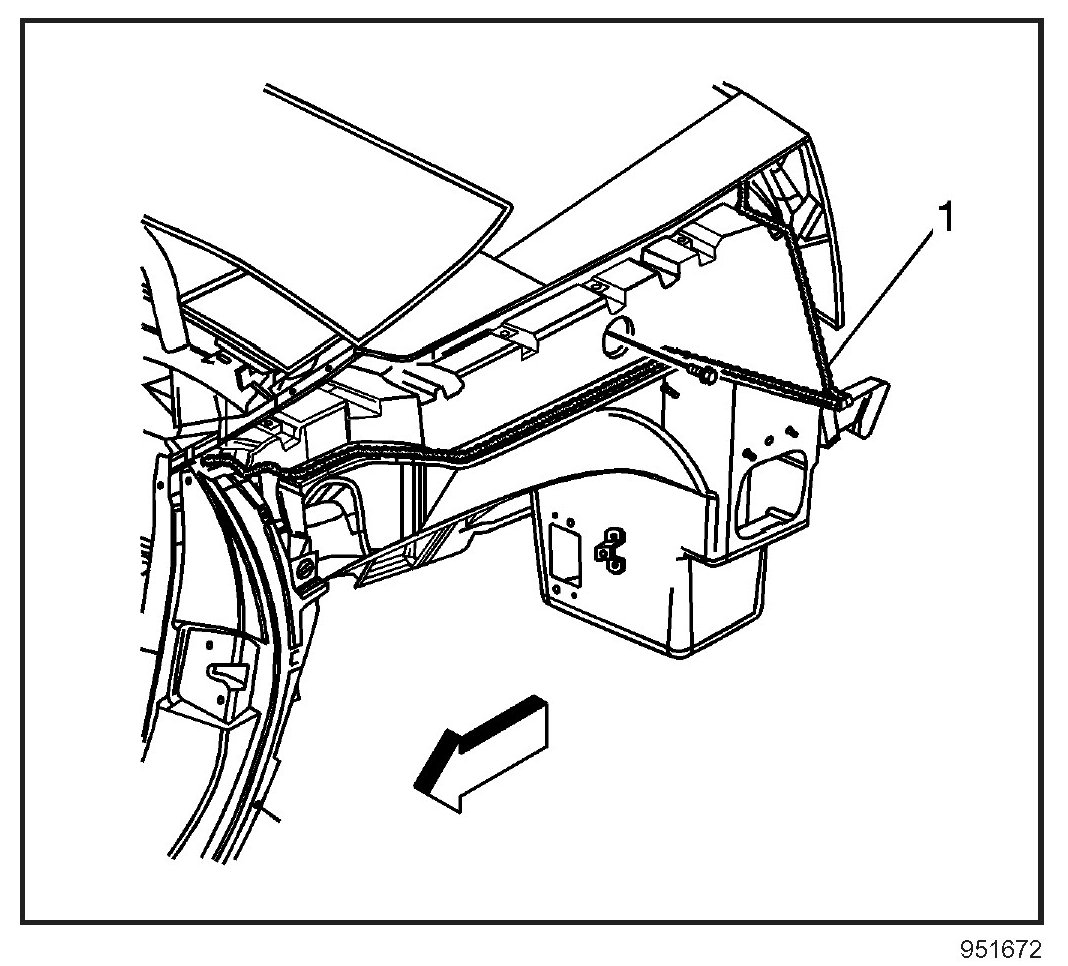 3. Apply a consistent bead of structural adhesive (1) 10 mm (3/8 in) in diameter to the rear structure to mate with the rear compartment frame. Refer to Sheet Molded Compound (SMC) Panel Bonding.