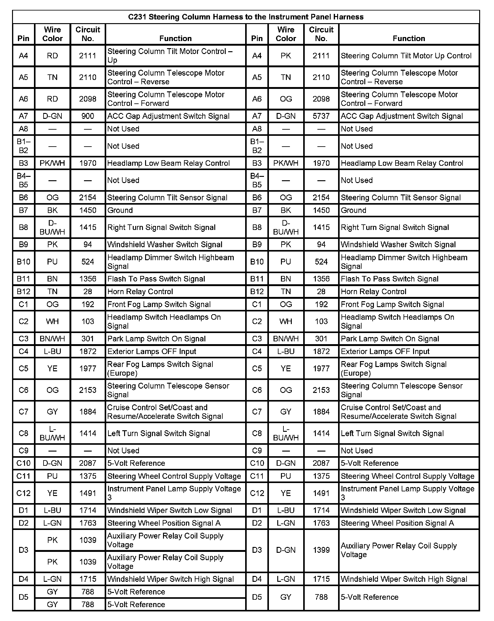 C231 Steering Column Harness to the Instrument Panel Harness (Pin A4 To D5):