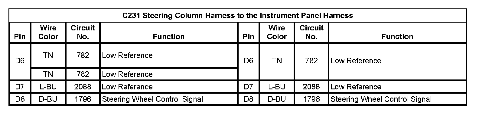 C231 Steering Column Harness to the Instrument Panel Harness (Pin D6 To D8):