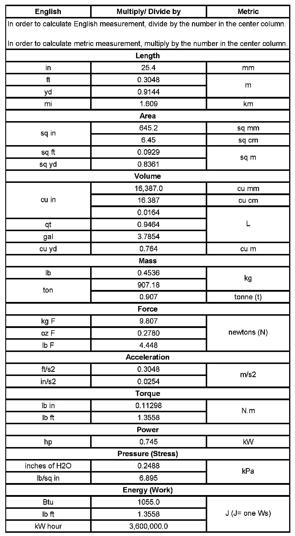 US English/Metric Conversion